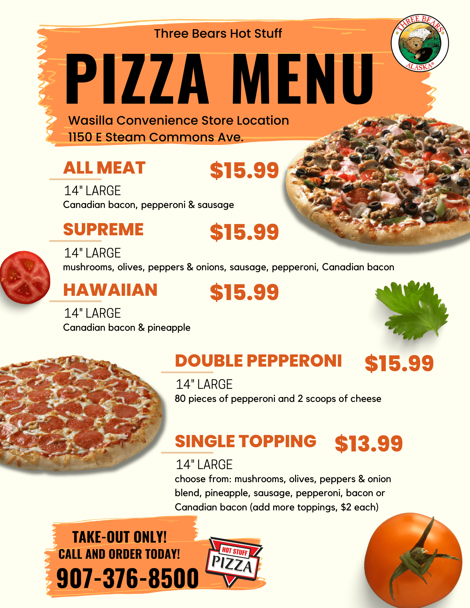 The Three Bears Wasilla Convenience Store features: bulk propane, Shell fuel, diesel, bulk propane, deli food, convenience and grocery items. Our newest Three Bears Alaska edition, the convenience store offers Hot Stuff Pizza and your favorite deli foods lime chicken tenders and fried mushrooms! Also you can order large, made to order, 14 inch to-go pizzas. There is also an RV dump station, the cost is $10.